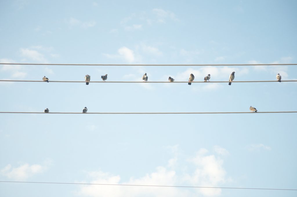 We still notice them, sometimes, but soon forget their presence. These days they swish more impetuously, in front of speeding vehicles, barely making it, overconfident. They stare down at us, perched on a myriad cables overhanging our city’s space. Curious groups overseeing our bustle, the haste of our misunderstood time. Poised on roofs or in the hollows of a rickety overpass, their plumped up chests point to the sky dignified. Then, a steep dive. In brief trips from one vector to another, deep murmurs infuse the air, whenever our ear manages to filter, the mass of sounds looming, echoes clashing against brash new buildings. They fly over our park, landing on the faded bridge that crosses over a turbulent river of cars. Their flights are oblivious to change from the increased traffic, our frantic drivers trying to beat the hour, lost in neurotic worry. Pigeons plunging into space that used to be innocent, now taken by construction sites, modern apartment buildings, sets of even more cabling, crisscrossing between. Reaching long, a gray palette of feathers extends before take off, and in a swift sweep, before I know it, they’ve landed with conviction on the next grimy roof. I heard their guttural remarks just the other day, talking amongst themselves, but their meaning got muffled by the wood polisher machine, the tile cutter going full blast, well into the afternoon. ¿What is the secret to their excitement? Pigeons everywhere, so much so, barely anyone ever notices. Coexisting on our roofs, inside carcasses of old buildings soon to be demolished. The common invaders cradle my afternoon, in layers of foggy gray, creamy white, and homey coos.